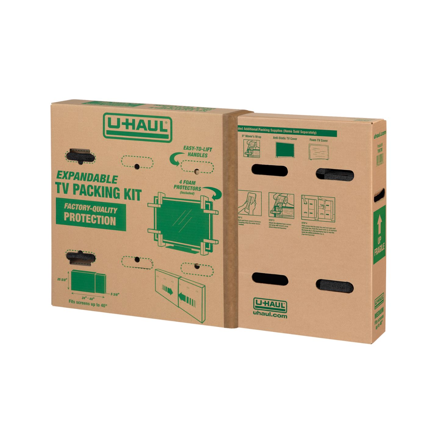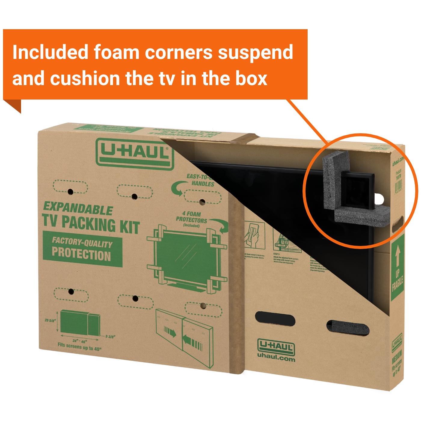 Each box includes built-in, easy-to-lift handles that make moving a TV easier. This moving box kit also contains four foam pieces that slide over each corner to suspend and cushion the TV from impact, providing eight points of protection.