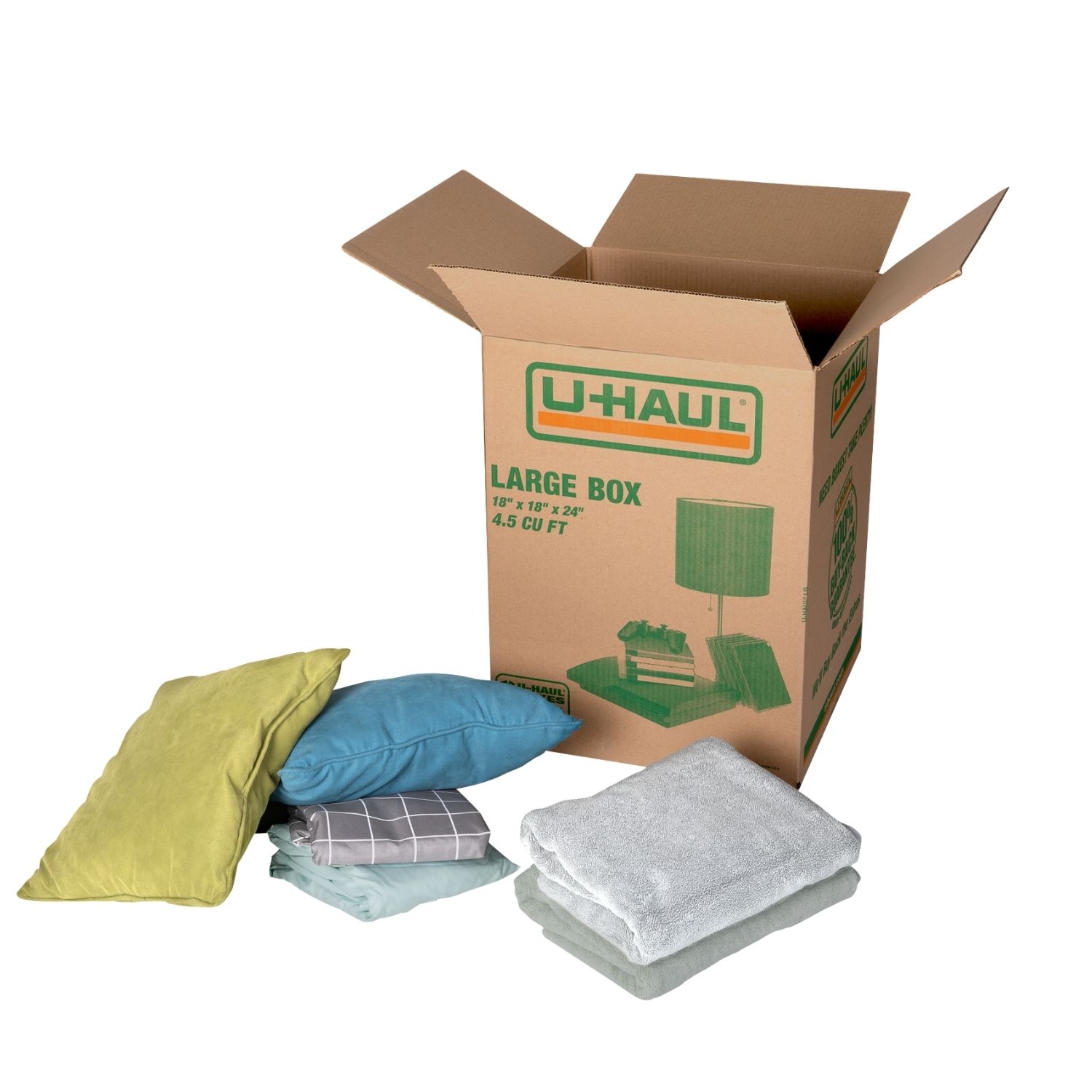 The U-Haul large moving box is ideal for moving, storing, or shipping a wide variety of large, lightweight items. This includes small lamps, medium/large lampshades, stereo speakers, board games, stuffed animals, pillows, clothing, and more. Our large moving boxes hold up to 65 pounds and are 100% recyclable and reusable for an eco-friendly move. With built-in features like our signature Flap Locks, the U-Haul large moving box is guaranteed to make moving easier!